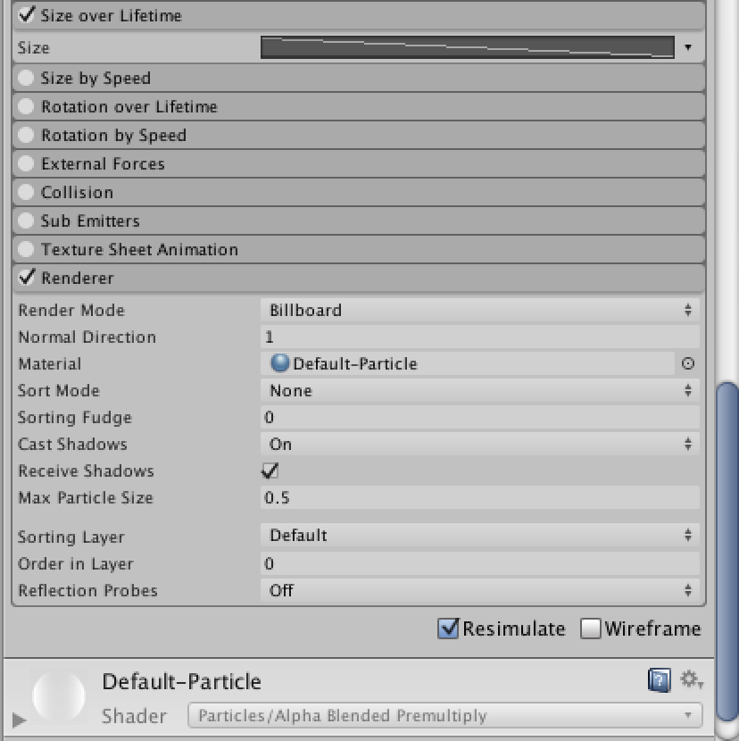 発生した粒子が次第に消えていくように見せるには、時間経過によって透明にするか、粒子の大きさを0にするかのどちらかとなる。これらはColor over LifetimeやSize over Lifetimeで表現できる。今回はSize over Lifetimeを使って、サイズが単調減少するようにした。